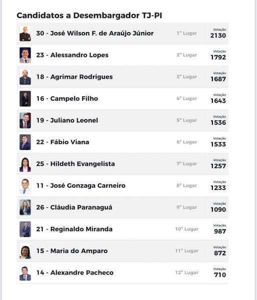 Na terceira fase do processo de escolha, os(as) Desembargadores(as) do TJ-PI escolherão três nomes para a lista tríplice. Por fim, o Governador do Estado, Wellington Dias, irá escolher qual dos três nomes será o(a) novo(a) Desembargador(a) do Tribunal de Justiça do Estado.