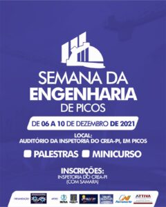 O evento acontecerá no Auditório da Inspetoria do CREA (Conselho Regional de Engenharia) de Picos.