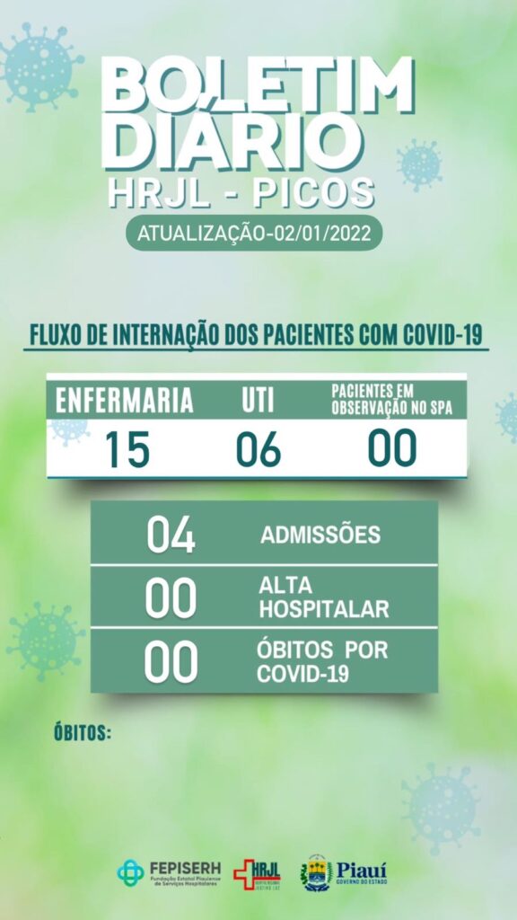Na noite desta quarta-feira, 2, o Hospital Regional Justino Luz, em Picos, também divulgou novo boletim epidemiológico informando que 21 pacientes estão internados no setor Covid-19, sendo que, 15 deles na enfermaria e 06 na Unidade de Terapia Intensiva (UTI) de Síndrome Respiratória Aguda Grave.