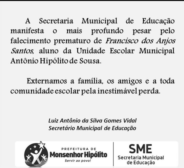 Em razão da trágica morte do estudante, a Secretaria Municipal de Educação de Monsenhor Hipólito divulgou uma nota de pesar se solidarizando com os familiares enlutados.