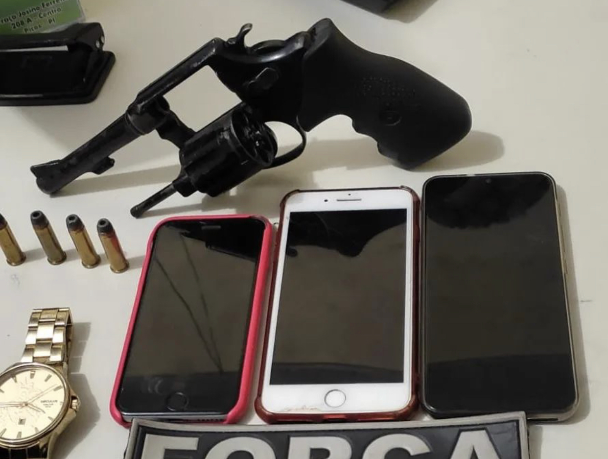 A Policia Militar conseguiu apreender arma e recuperar um relógio e três celulares / (Fotos: Policia Militar de Picos)