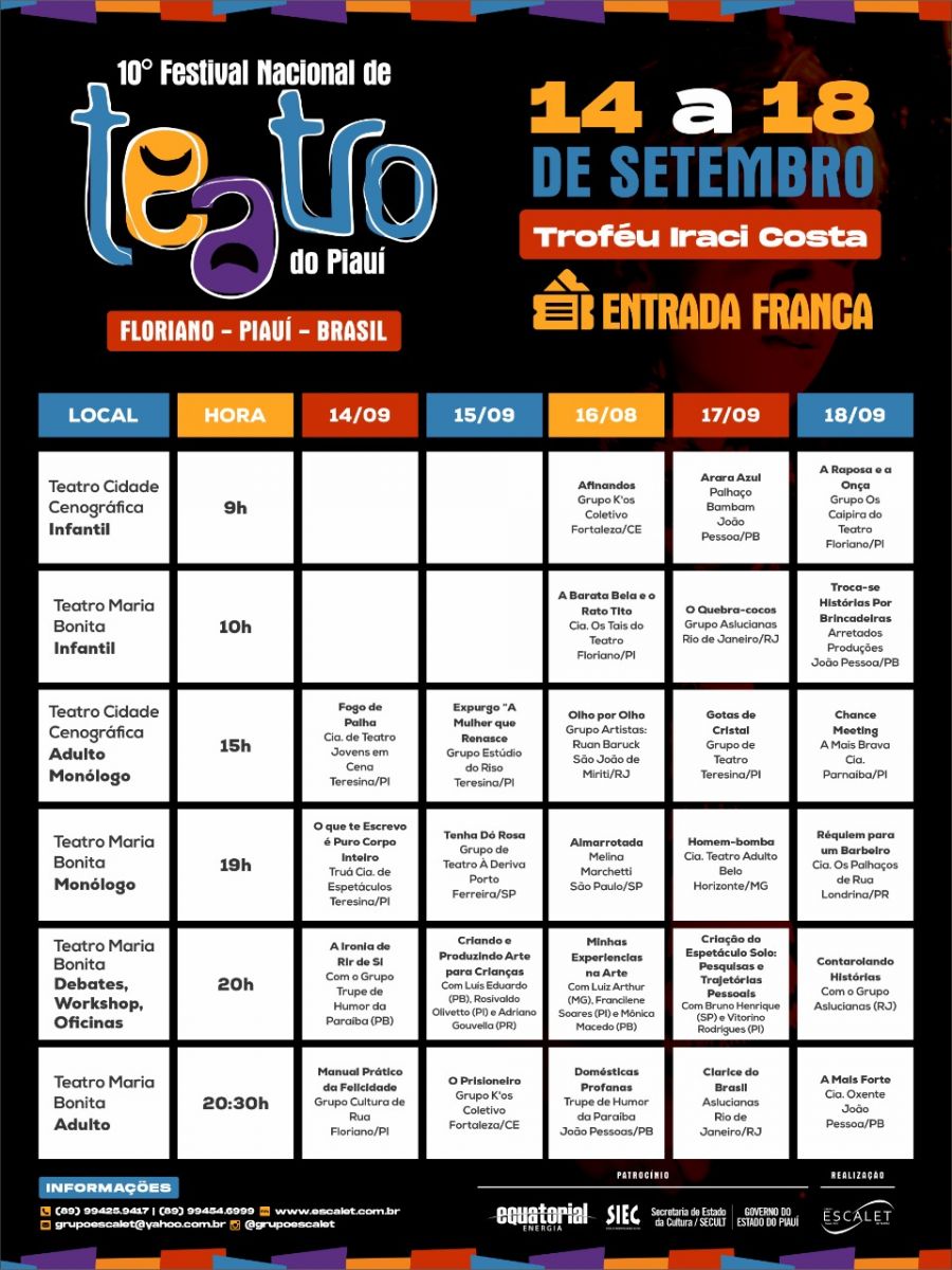 Este ano, o Festival Nacional de Teatro do Piauí contará com a apresentação de 21 espetáculos nos teatros Cidade Cenográfica e Maria Bonita. A entrada é gratuita e a programação inclui, além dos espetáculos infantis, adultos e monólogos, debates, oficinas e workshops. Os detalhes dia por dia podem ser acessados através do site https://www.escalet.com.br/.