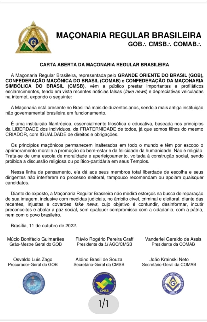 “Respeitamos a Constituição do Brasil, o seu Estado de Direito, as nossas Leis e a sociedade brasileira, pelo qual requeremos o devido respeito”, afirma o Grão-Mestre do Oriente de Minas Gerais.