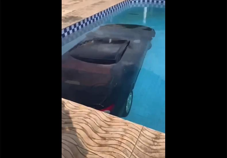Um carro de passeio, modelo Corolla, invadiu a piscina de um hotel e quase atingiu duas pessoas que estavam banhando. Toda a ação foi registrada por uma câmera de segurança.