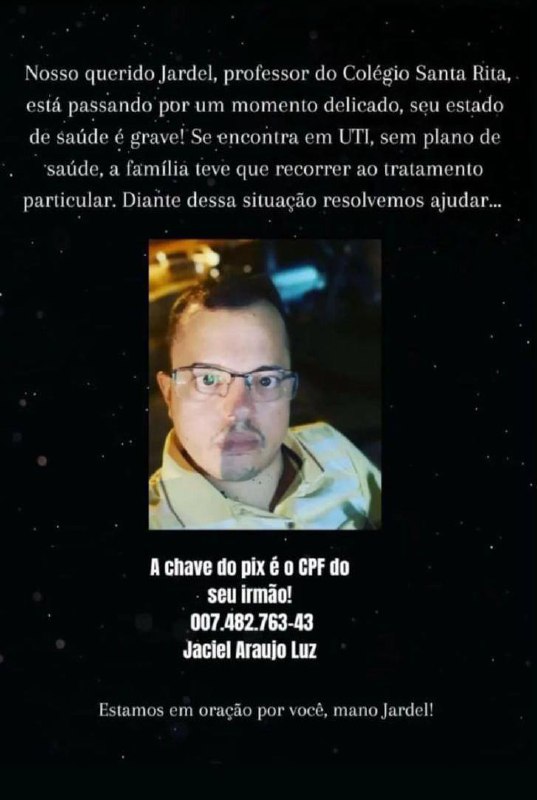 Jardel é professor de Matemática e Geometria em um colégio particular na cidade de Picos e está passando por um momento complicado, onde seu estado de saúde é grave e o mesmo encontra-se internado em UTI no Hospital São Marcos, em Teresina.