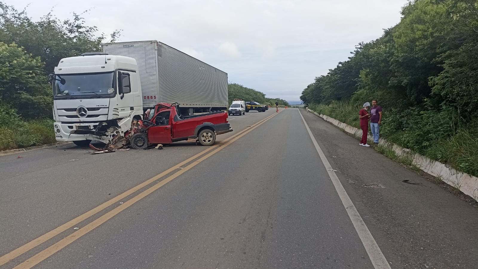 Derick Rodrigues Pires, motorista da carreta, relatou que seguia em direção à cidade de Marcolândia quando percebeu a picape Strada trafegando no sentindo contrário, aparentemente desgovernada e tomando a faixa contrária, até colidir contra a carreta.