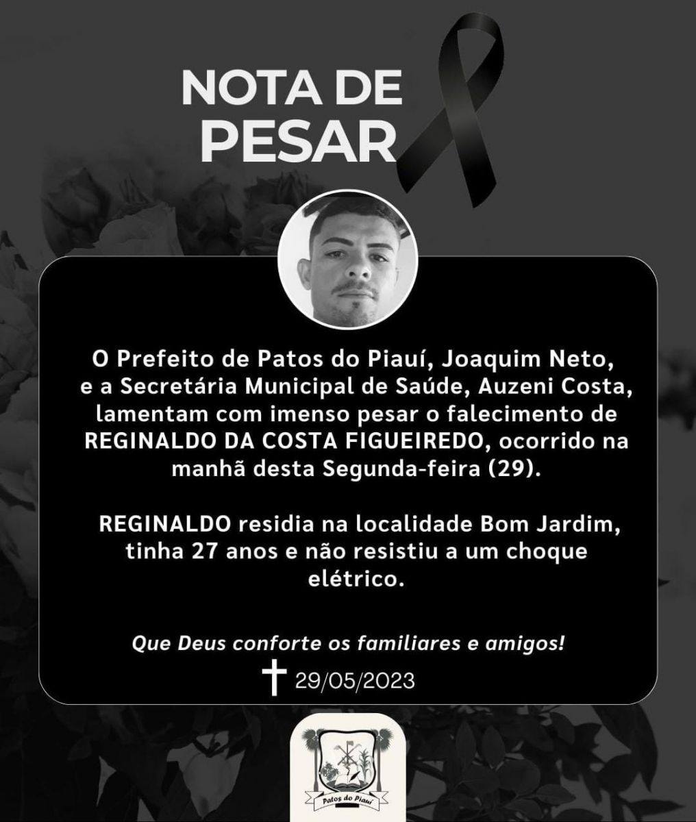 A cidade de Patos do Piauí está luto com a perda precoce do jovem Reginaldo da Costa Figueiredo de 27 anos. O rapaz faleceu nesta segunda-feira, 29 de maio, após sofrer um choque elétrico.