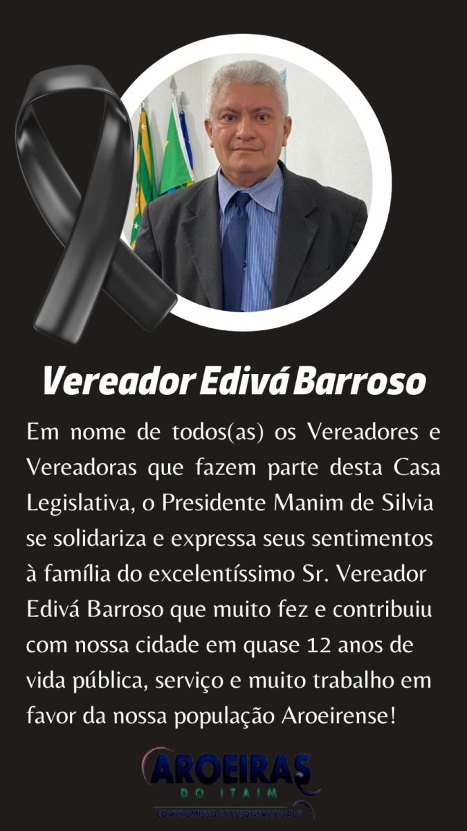 "É com profunda tristeza que informamos o falecimento do vereador Edivá Barroso Leal de Carvalho, ocorrido hoje às 4:00 horas da manhã, no hospital HTI de Teresina. O Presidente Manim de Silvia e os demais Vereadores se solidarizam e manifestam total apoio e conforto à família do querido, admirado e respeitado Edivá Barroso, que tanto trabalhou e tanto realizou pela nossa cidade de Aroeiras do Itaim. Edivá será eternamente lembrado em nossas histórias, nossas memórias e em nossos corações!"