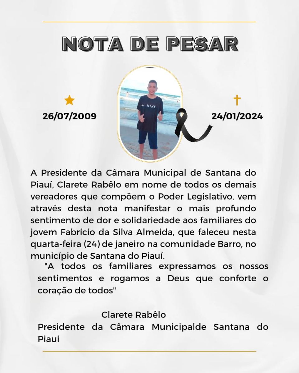 A Presidente da Câmara de Santana do Piauí, Vereadora Clarete Rabêlo, em nome de todos os demais Vereadores, expressou seus sentimentos de solidariedade à familia do jovem Fabricio da Silva Almeida.