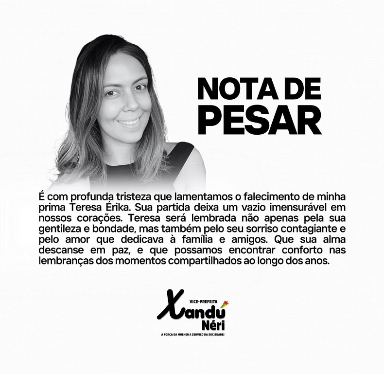 A vice-prefeita de Picos, Xandú Néri, usou a rede social para dedicar uma mensagem e lamentar a partida de Teresa Érika.