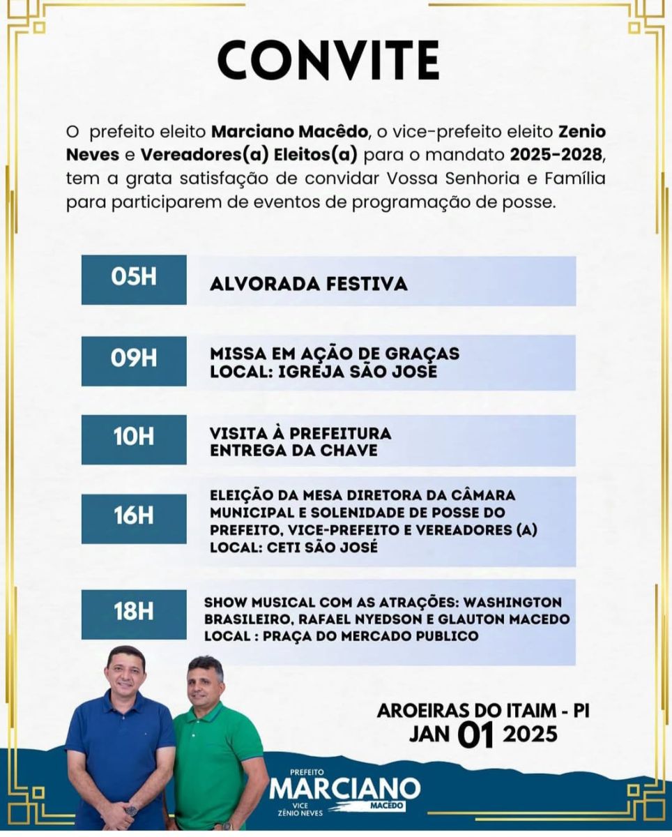 Programação da Posse no dia 1º de janeiro de 2025