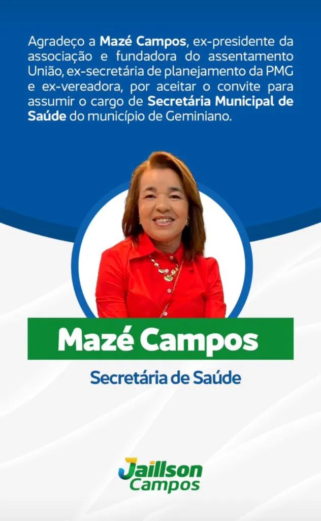 Conforme anúncio feito pelo prefeito eleito, ocupará o cargo de secretária de Saúde de Geminiano, Mazé Campos, que é ex-presidente da Associação e fundadora do Assentamento União.
