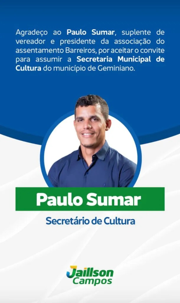 Para a Secretaria de Cultura, Jaillson Campos confirmou o nome de Paulo Sumar, que é suplente de vereador e presidente da Associação do Assentamento Barriros.