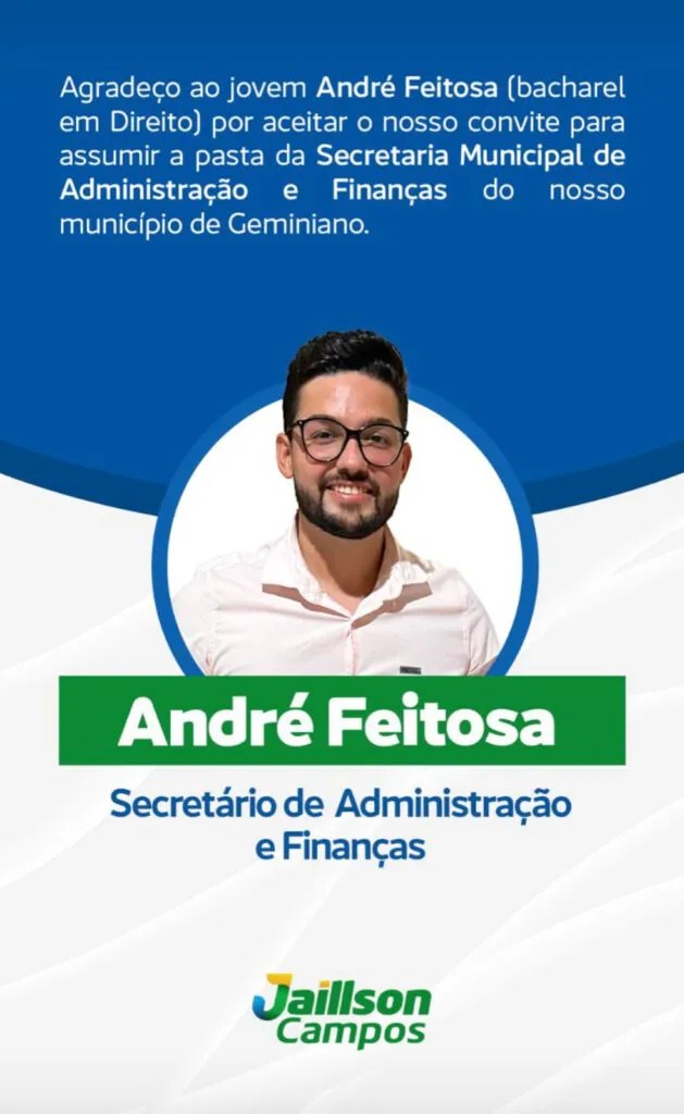 O prefeito eleito de Geminiano, Jaillson Campos (PSD), anunciou na noite deste sábado, 28 de dezembro, três nomes que farão parte do secretariado.
