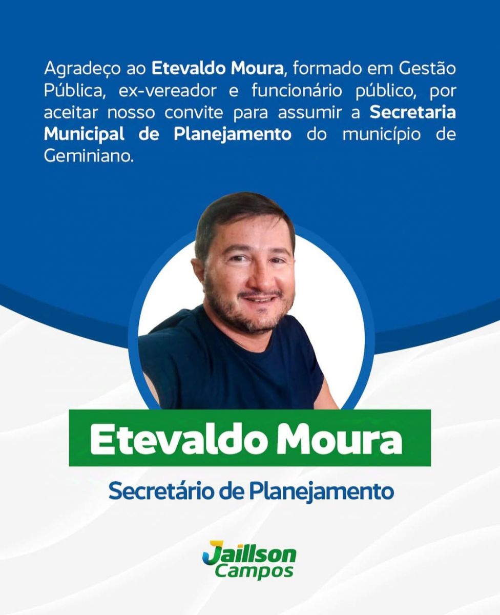 Já para a Secretaria de Planejamento, o prefeito eleito confirmou o nome de Etevaldo Moura, formado em gestão pública e ex-vereador de Geminiano.