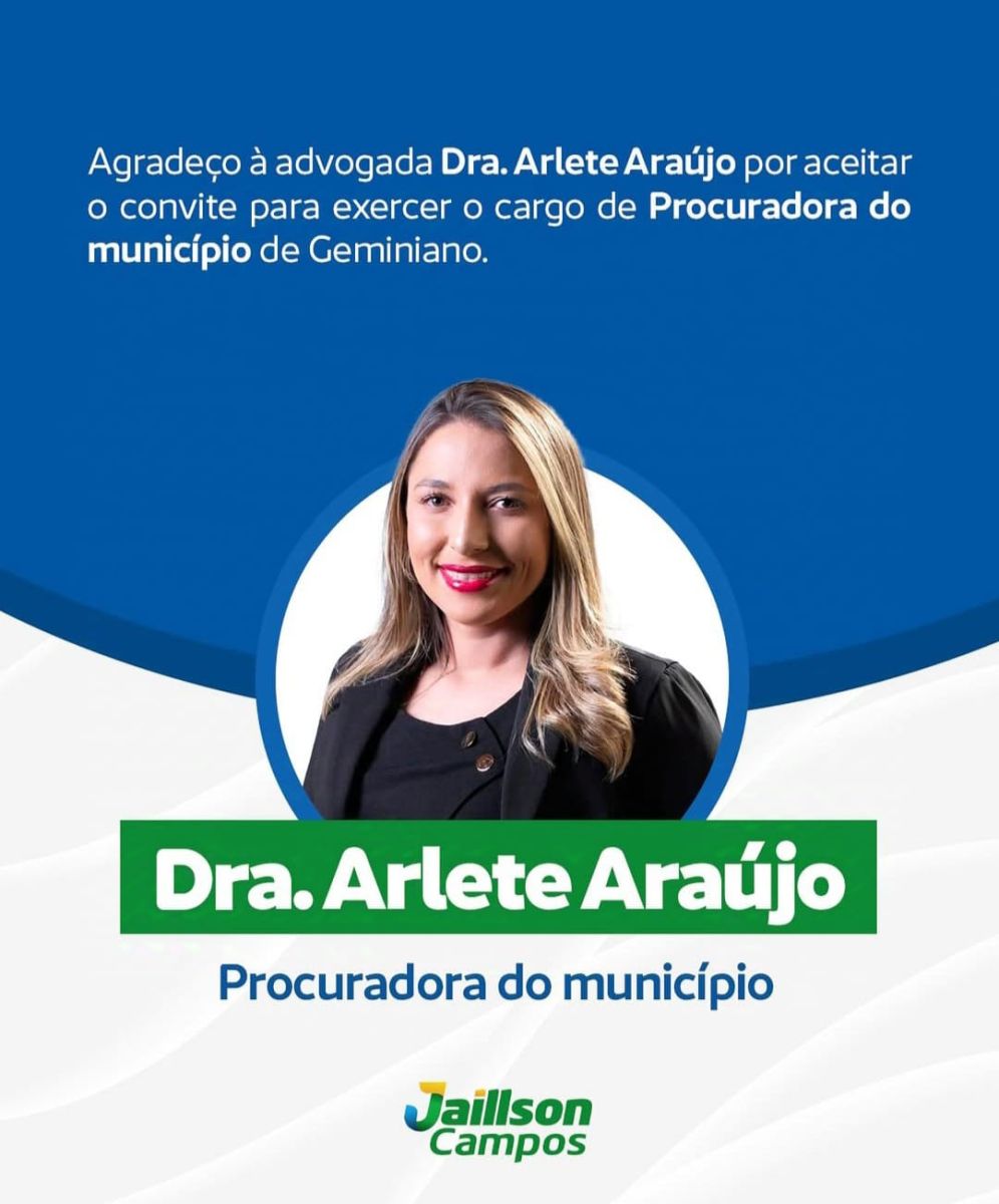 Conforme anuncio feito nas redes sociais do prefeito eleito de Geminiano, para a Secretaria de Assistência Social, Jaillson confirmou o nome da bacharel em direito Daniele Gonçalves.