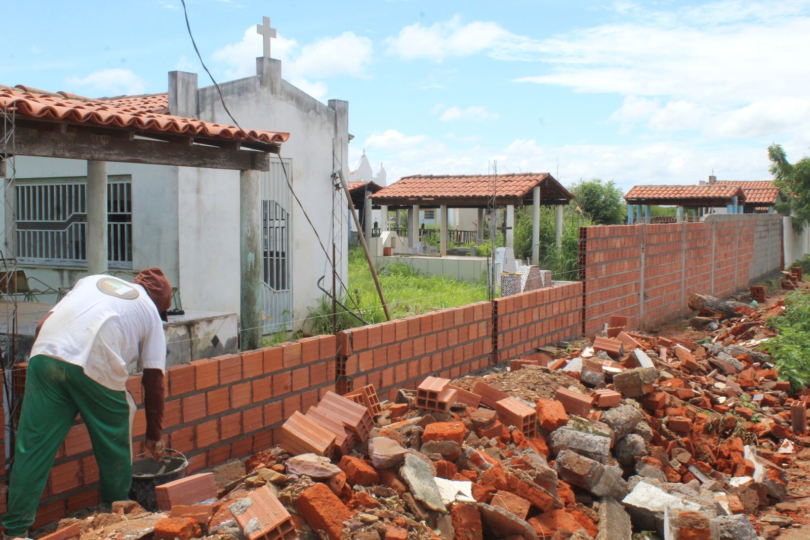 Parede do cemitério de do bairro Arapecida sendo recustruída