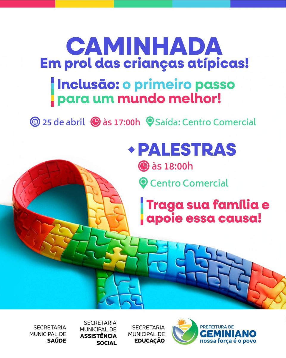 Com o objetivo de promover a inclusão e despertar a consciência coletiva sobre o acolhimento das crianças atípicas, a cidade de Geminiano se prepara para receber a Caminhada “Inclusão: o primeiro passo para um mundo melhor!”, que acontece nesta quinta-feira, 25 de abril, a partir das 17h, com concentração no Centro Comercial do município.