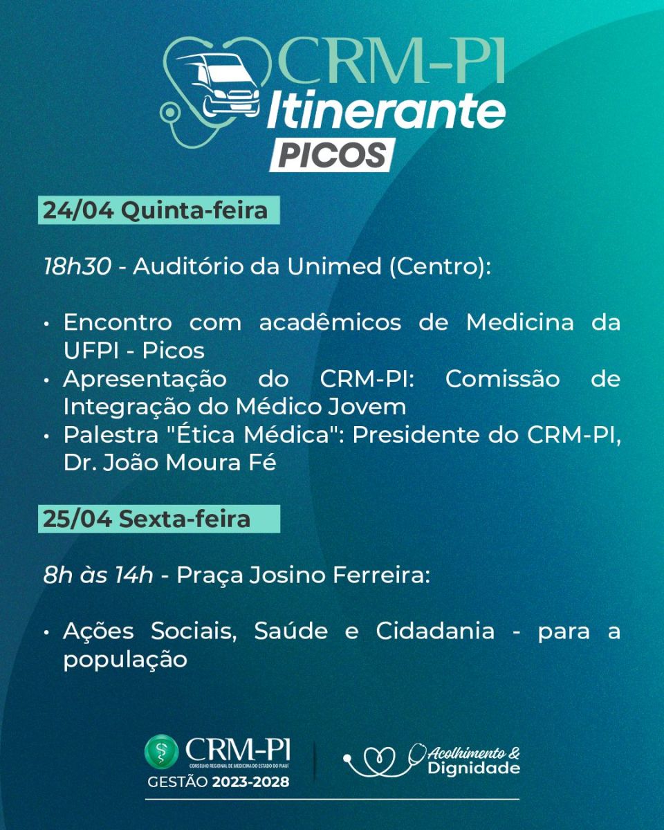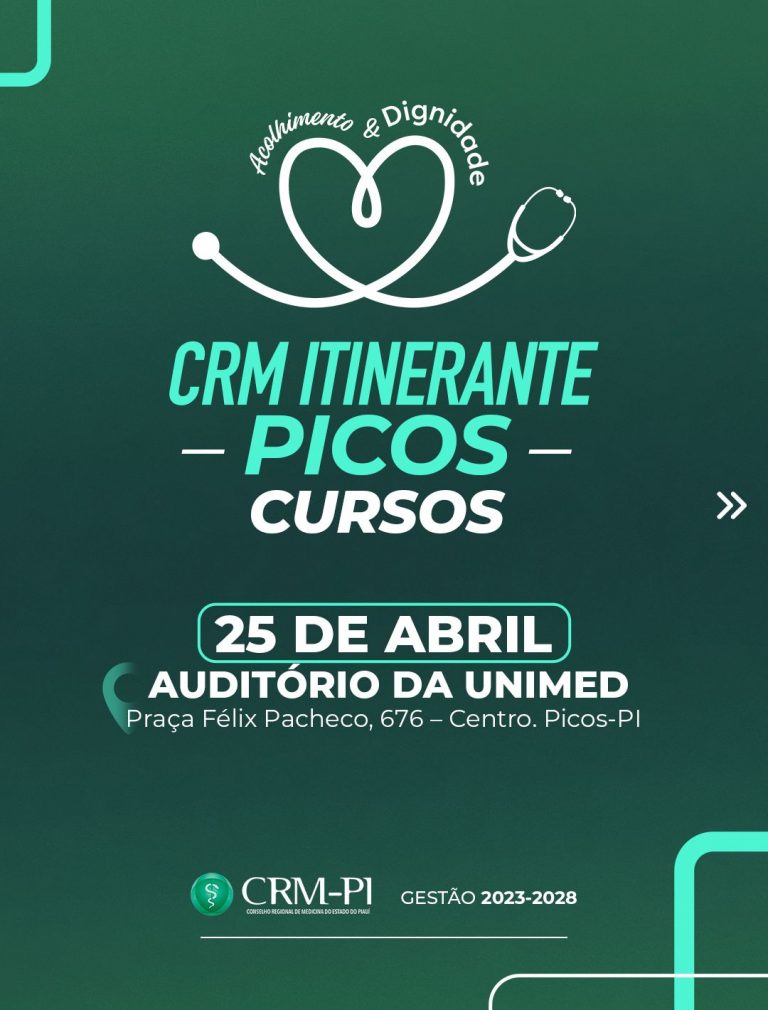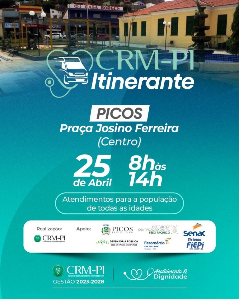 O Conselho Regional de Medicina do Piauí (CRM-PI) realizará mais um CRM Itinerante, dessa vez em dois municípios do sul do Estado. Em Santana do Piauí, no dia 24 de abril; e em Picos, no dia 25 de abril.