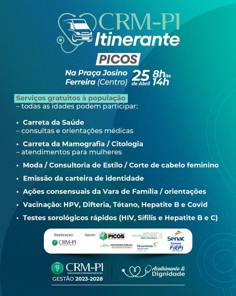 Serão serviços de ações consensuais de família, pela Defensoria Pública do Piauí, emissão da carteira de identidade, pelo Instituto de Identificação do Piauí, serviços de modela e beleza, oferecidos por profissionais do Senac Picos e várias ações e orientações de saúde pela Secretaria de Saúde do município, um dos nossos apoiadores. Também a Carreta da Mamografia e Citologia, para mulheres, e a Carreta da Saúde, com médicos atendendo a população de todas as idades. O CRM Itinerante na Praça começa às 8 horas e segue até as 14 horas.