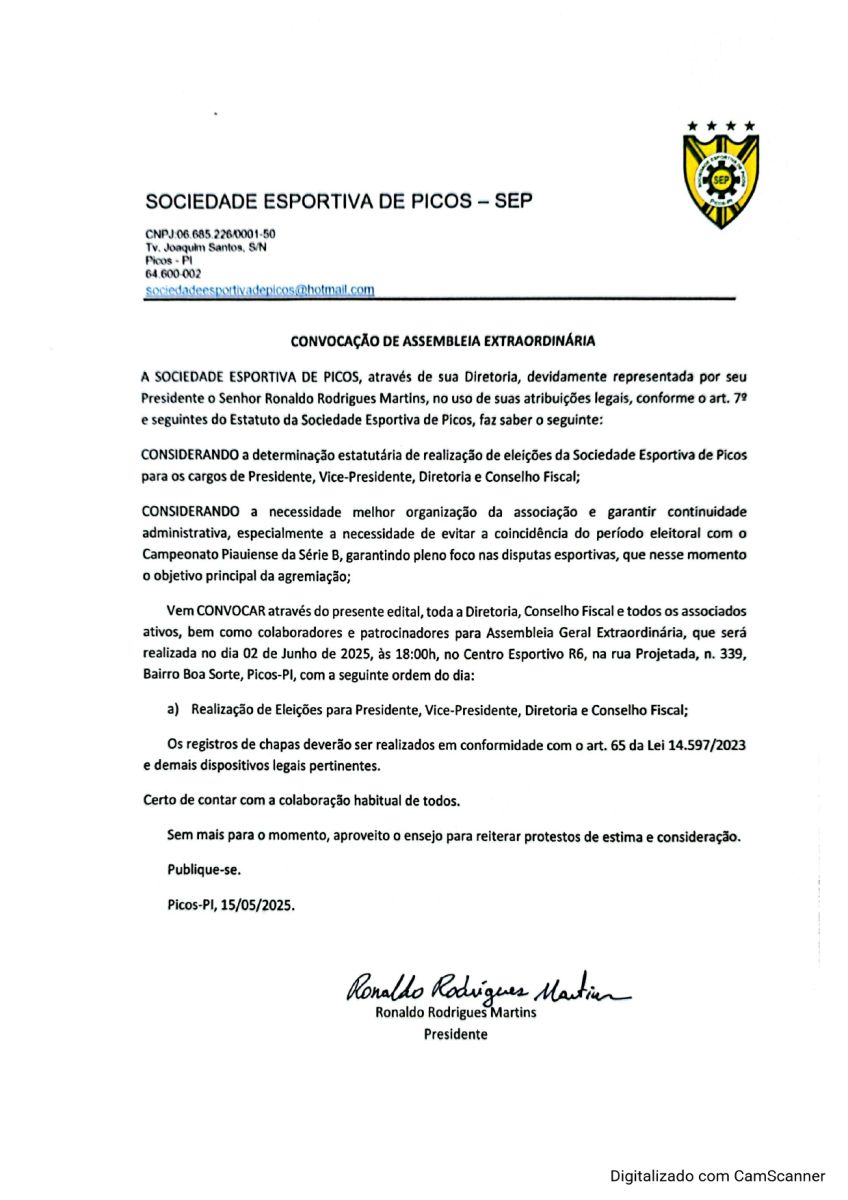 A Sociedade Esportiva de Picos, por meio de sua diretoria, estará realizando no dia 2 de junho, uma assembleia extraordinária para eleger o presidente, vice e demais diretores do clube pelos próximos 3 anos.