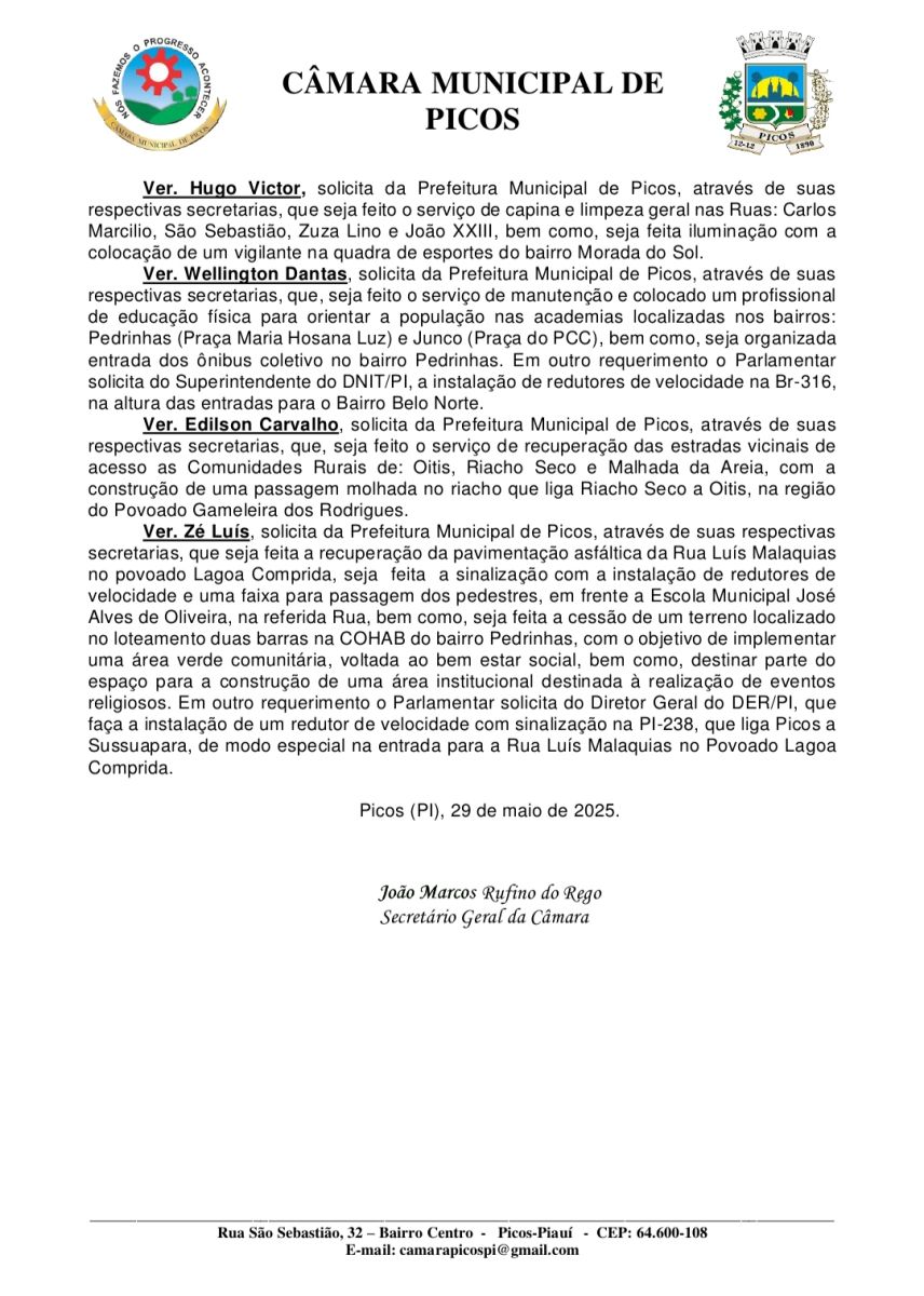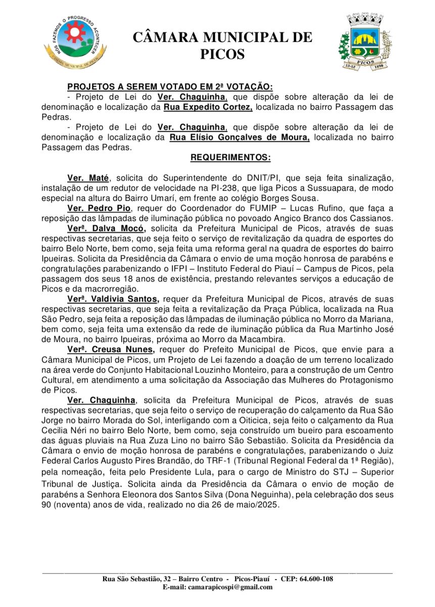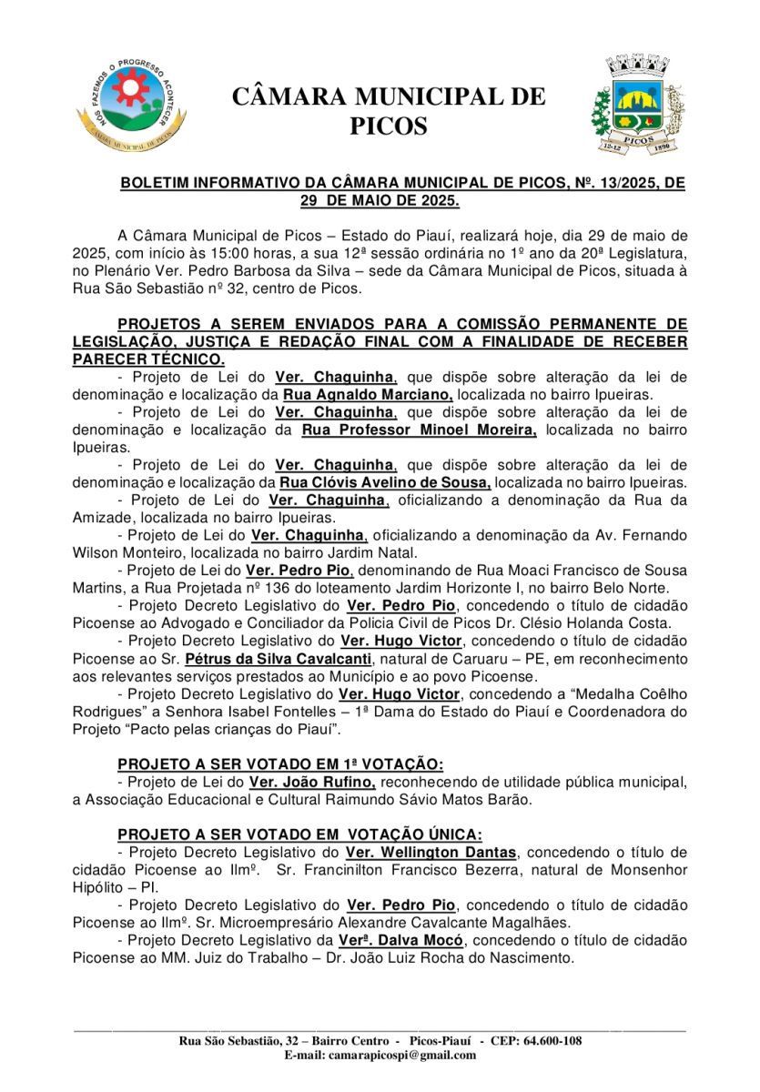 A Câmara Municipal de Picos realizou nesta quinta-feira (29) de maio, sessão ordinária que foi presidida pelo vereador e presidente da casa, Rinaldinho (MDB), e que teve vários projetos e requerimentos em pauta para serem apreciados e votados, além de outros que foram encaminhados para as Comissões Permanentes para receberam o parecer técnico.
