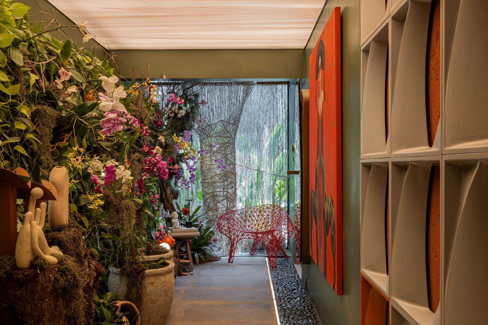 Entre as possibilidades do público de imergir graciosamente nos elementos da natureza que imperam nesta edição, o ambiente “Jardim Penteado”, assinado por Mais Design Interiores, é a manifestação de um orquidário que mostra ser possível criar um espaço de encontros e tranquilidade em meio à agitação do dia a dia. A ideia foi a de resgatar os antigos jardins de inverno e trazer uma nova roupagem.