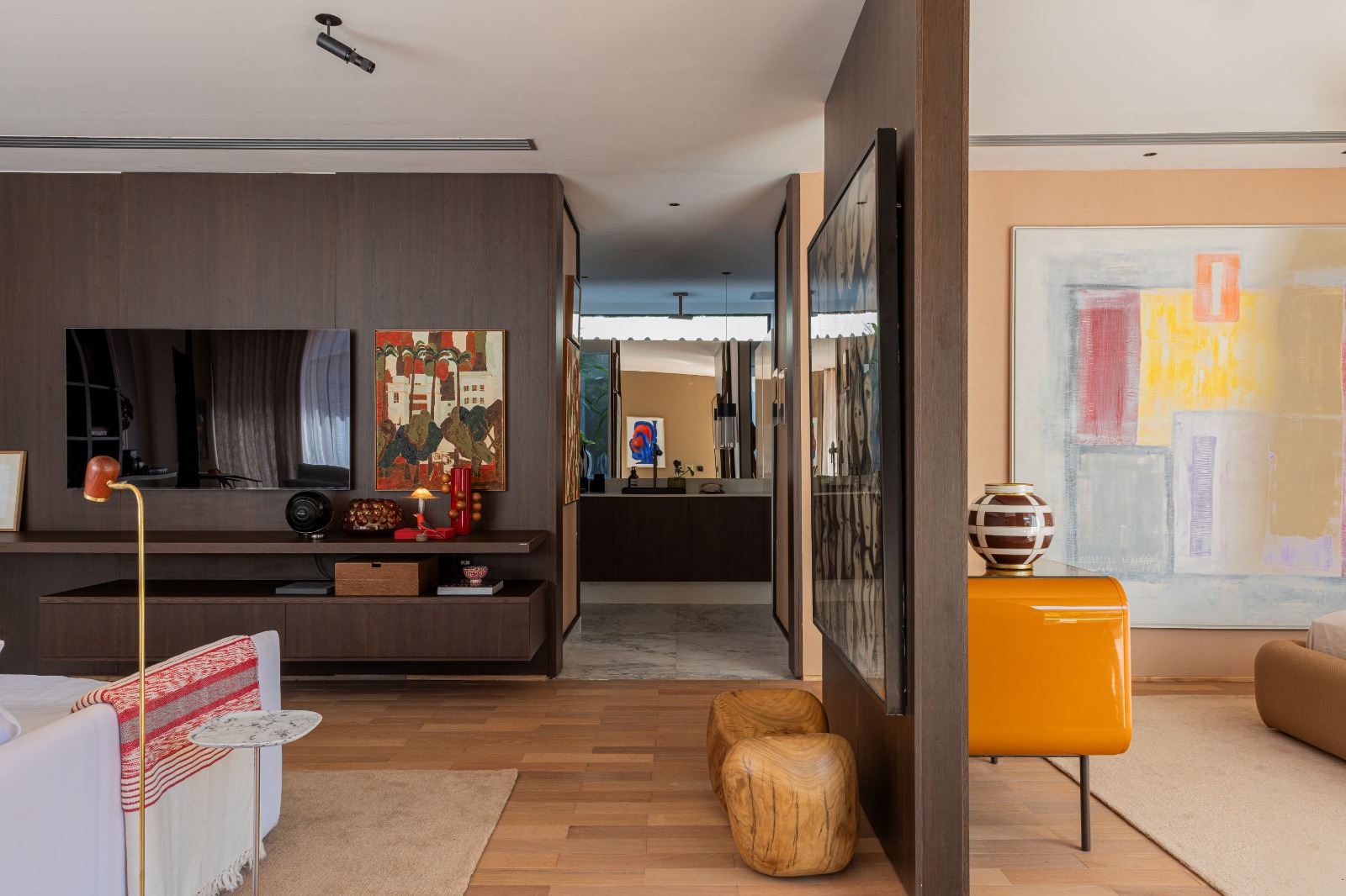 As experiências inesquecíveis da mostra também incluem um passeio encantador pela “Suíte RV”, assinada por Studior2. O espaço foi concebido como um refúgio sensorial no qual o casal pode se reconectar e viver momentos únicos em uma atmosfera de poesia visual. Cada elemento carrega uma narrativa de descobertas, transformando o cotidiano em contemplação. Em sinergia com a proposta de encantar, o “Apartamento Dois”, assinado por José Ribeiro, mantém um olhar voltado para a contemporaneidade ao traduzir um jeito atual de morar em que conforto, estética e funcionalidade caminham juntos. A conexão dos elementos dispostos no ambiente reitera que, mais do que um lar, o apartamento reflete um estilo de vida sofisticado e autêntico.
