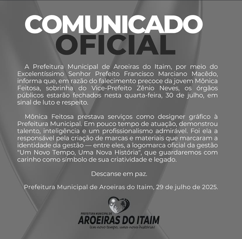 A Prefeitura Municipal de Aroeiras do Itaim decretou luto oficial de um dia, nesta quarta-feira, 30 de julho, em virtude do falecimento precoce de Mônica Feitosa, colaboradora da equipe de comunicação e sobrinha do vice-prefeito Zênio Neves.