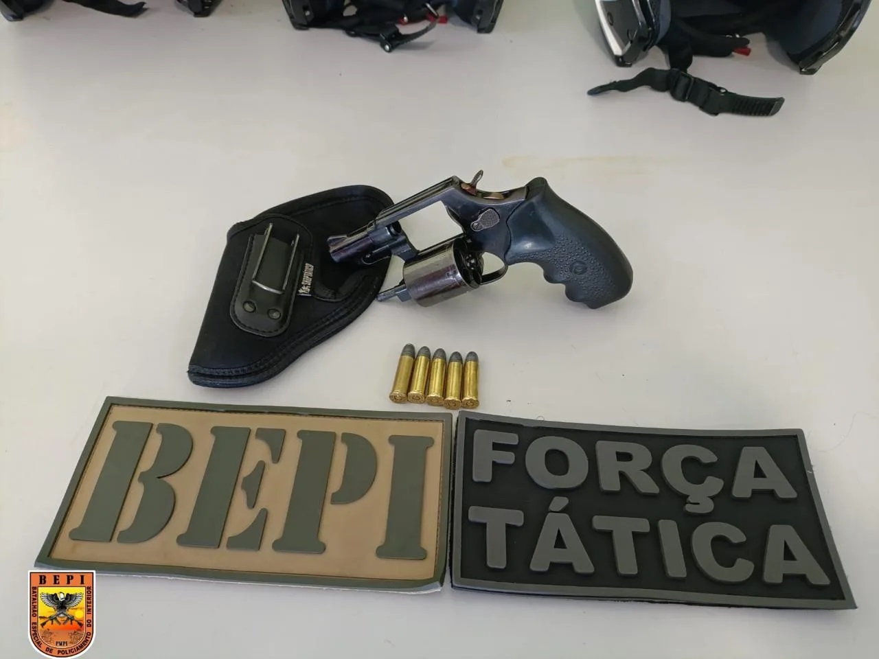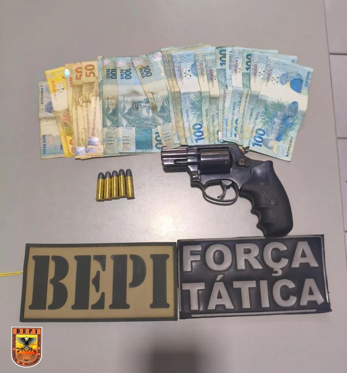 De acordo com a PM, os policiais receberam denúncia de que um indivíduo armado estaria no bairro Bela Vista para negociar uma arma de fogo. Durante o patrulhamento, as equipes abordaram dois suspeitos em uma motocicleta Honda Bros, que apresentava sinais de adulteração e restrição de roubo. Com eles, foi encontrado um revólver calibre .38 municiado com cinco cartuchos intactos.