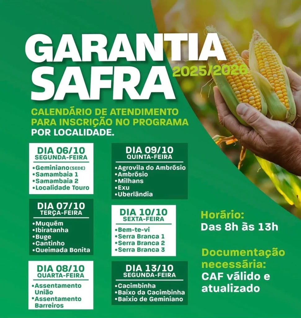 De acordo com o calendário divulgado, os atendimentos acontecem sempre das 8h às 13h. Além de Geminiano (sede), também serão atendidas as localidades Samambaia 1, Samambaia 2, Touro, Muquém, Ibiratanha, Buge, Cantinho, Queimada Bonita, Assentamento União, Assentamento Barreiros, Agrovila do Ambrósio, Uberlândia, Exu, Milhans, Serra Branca e Cacimbinha. Para efetuar a inscrição, o agricultor deve apresentar o CAF (Cadastro Nacional da Agricultura Familiar) válido e atualizado.
