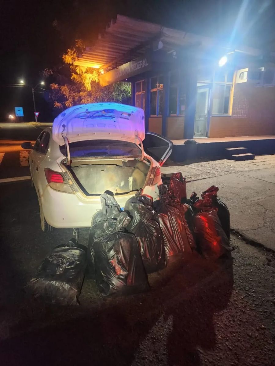 Diante da suspeita, foi realizada uma busca minuciosa, que resultou na localização de 13 sacos de cor preta contendo a substância ilícita, distribuídos entre o porta-malas e o banco traseiro do carro.