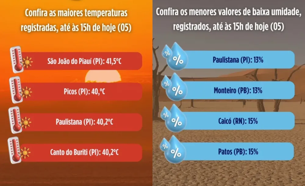 Os municípios mais quentes foram: São João do Piauí (41,5ºC), Picos (40ºC), Paulistana (40,2ºC) e Canto do Buriti (40,2ºC). Paulistana também liderou o ranking nacional com a menor taxa de umidade, atingindo 13%.
