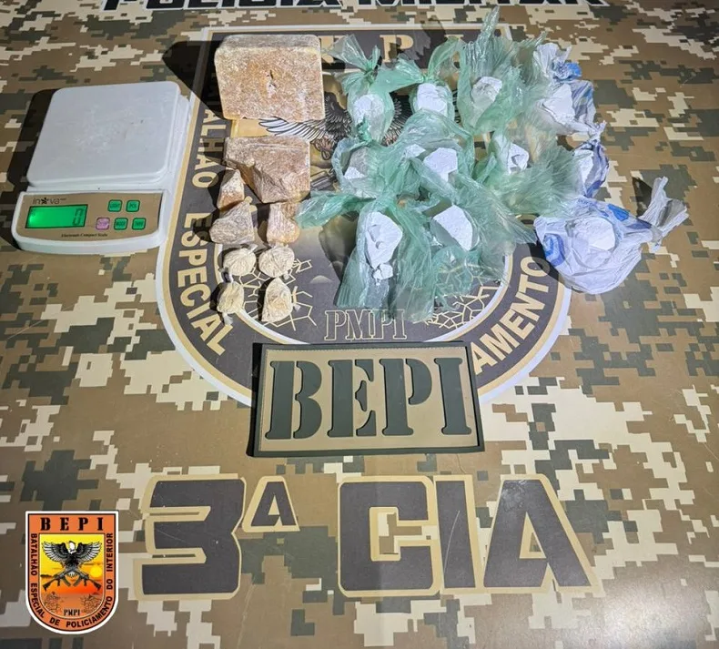 Durante a ação, os policiais encontraram dentro do imóvel 11 porções médias de substância análoga à cocaína, sete porções pequenas de crack, uma porção média de crack, um tablete de crack, além de uma balança de precisão.