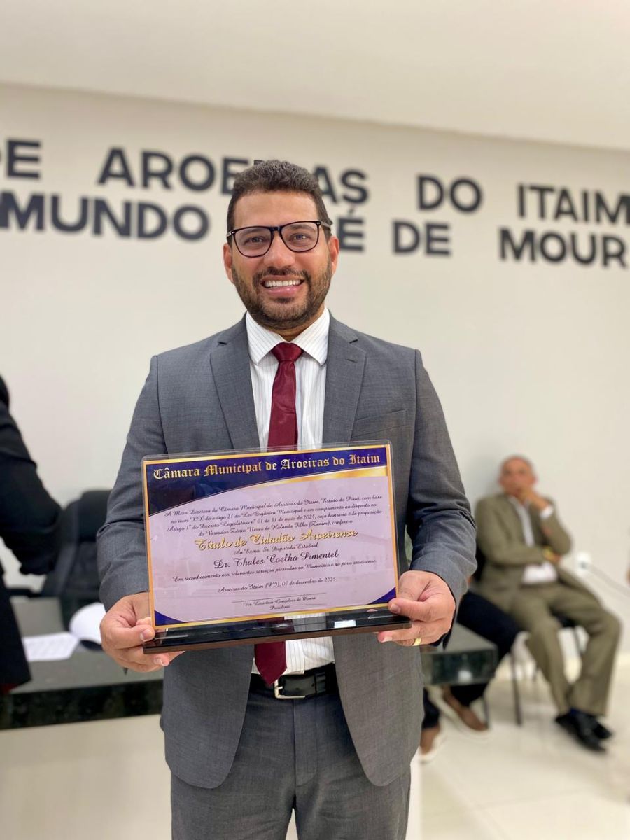 "Recebo hoje esta honraria com enorme alegria e senso de responsabilidade. O título de cidadão Aroeirense representa muito mais do que uma homenagem: ele simboliza o reconhecimento do trabalho, do empenho e da presença constante que temos dedicado a essa cidade querida. E, ao mesmo tempo, renova minha gratidão e meu compromisso de seguir trabalhando cada vez mais por Aroeiras, agora não apenas de coração, mas também de fato e de direito. Aroeiras do Itaim tem sido, para mim, um exemplo de força, união e esperança. Em cada visita, em cada diálogo, em cada demanda apresentada, percebo o quanto este povo acredita no futuro e luta diariamente para construir uma cidade mais justa, mais estruturada e mais desenvolvida. É essa determinação que me inspira, que me move e que me faz compreender a grandeza deste reconhecimento. Quero agradecer pela iniciativa e pela confiança depositada no nosso trabalho. Agradeço também a todos os parlamentares desta Casa, que nos recebem sempre com respeito, parceria e diálogo. Essa união entre os poderes é fundamental para que possamos avançar. Agradeço, igualmente, ao prefeito Marciano Macedo e ao vice-prefeito Zênio Neves, com quem temos construído uma relação séria, transparente e baseada no compromisso com o bem comum. O diálogo com o Executivo municipal tem permitido somar esforços e buscar soluções que atendam às necessidades da população. Aroeiras do Itaim sabe que pode contar comigo, com meu mandato e com minha dedicação. Este título, meus amigos, renova minha disposição de continuar defendendo os interesses desta cidade na Assembleia Legislativa, de trabalhar por mais investimentos, mais políticas públicas e mais oportunidades para nosso povo. Quero seguir lutando ao lado de vocês, levando mais qualidade de vida, desenvolvimento e dignidade para cada família aroeirense. Finalizo reafirmando meu compromisso: este mandato é de vocês. Esta homenagem, que recebo hoje com orgulho e humildade, será mais um combustível para que continuemos avançando, com trabalho, seriedade e respeito. Muito obrigado pelo carinho, pela confiança e por me acolherem como filho desta terra. Contem sempre comigo", afirmou Dr. Thales Coelho.
