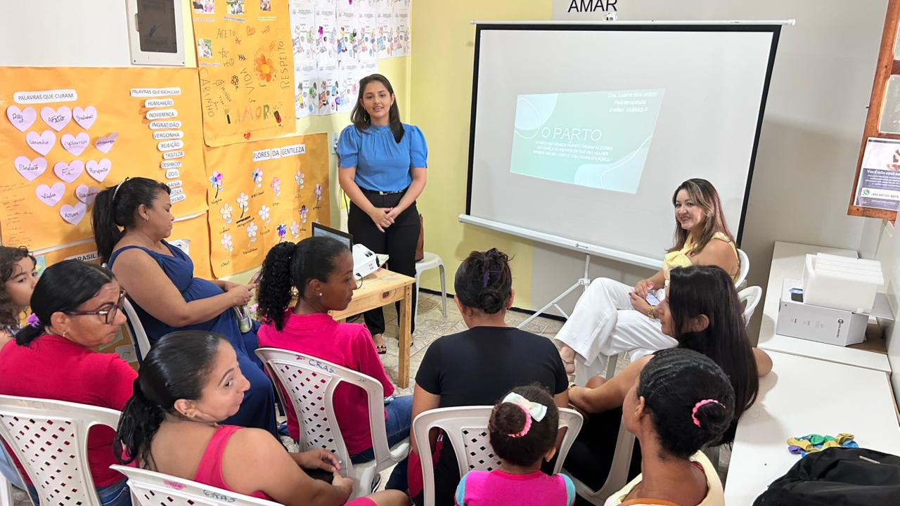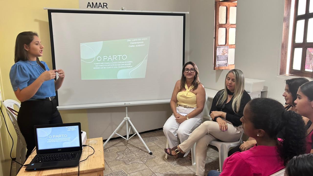 A atividade foi conduzida pela fisioterapeuta Luana Anjos, que abordou aspectos essenciais relacionados ao período gestacional, ao parto e aos cuidados no pós-parto, esclarecendo dúvidas e proporcionando um espaço de troca de experiências entre as participantes.