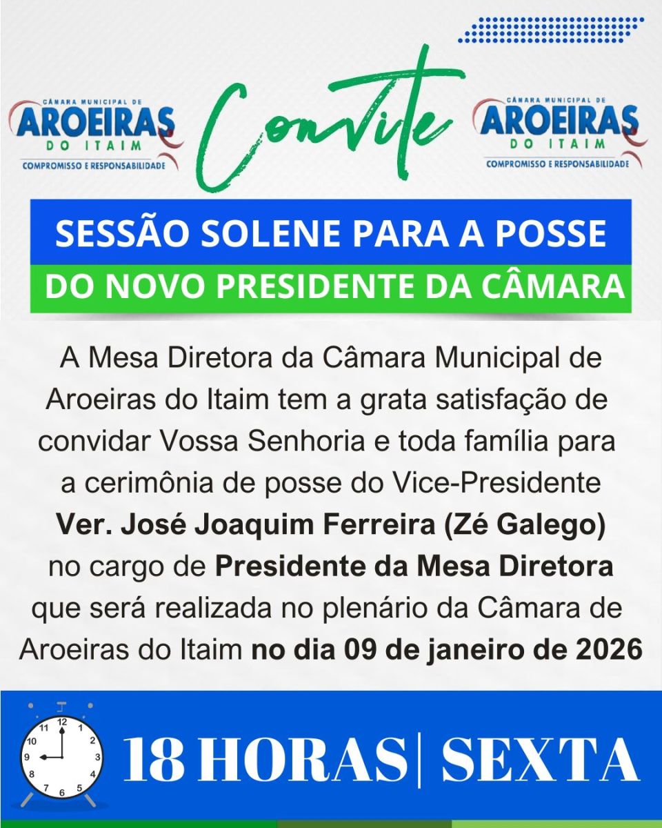 O Vereador José Joaquim Ferreira, conhecido como Zé Galego, será empossado como novo presidente da Câmara Municipal de Aroeiras do Itaim nesta sexta-feira, dia 09, a partir de 18 horas.