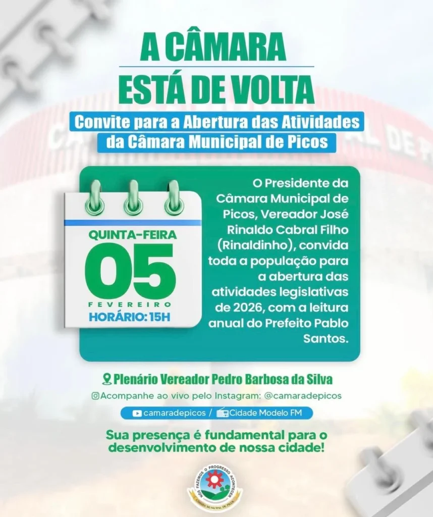 A Câmara Municipal de Vereadores de Picos dará início aos trabalhos legislativos de 2026 nesta próxima quinta-feira, dia 05, em sessão solene que marcará oficialmente a abertura do novo ano legislativo.