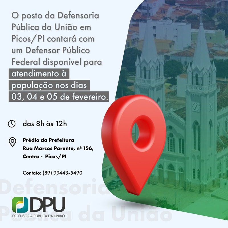 Teve início nesta terça-feira (03) o atendimento da Defensoria Pública da União (DPU) no município de Picos, ampliando o acesso da população à assistência jurídica gratuita em demandas envolvendo órgãos federais. O serviço está sendo realizado no prédio da Prefeitura de Picos e segue até o dia 05 de fevereiro, das 8h às 12h, atendendo moradores de Picos e da macrorregião.