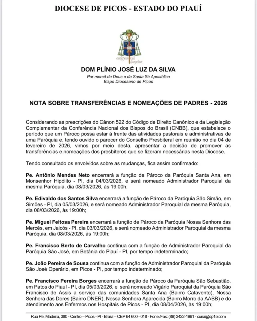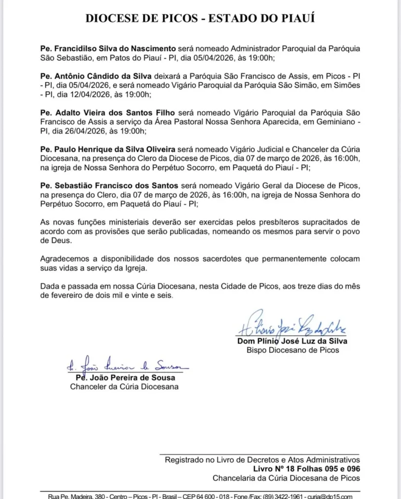 Outras nomeações anunciadas incluem o padre Antônio Cândido da Silva, que deixa a Paróquia São Francisco de Assis, em Picos, e assume como vigário paroquial da Paróquia São Simão, em Simões, com posse prevista para o dia 12 de abril, às 19h.