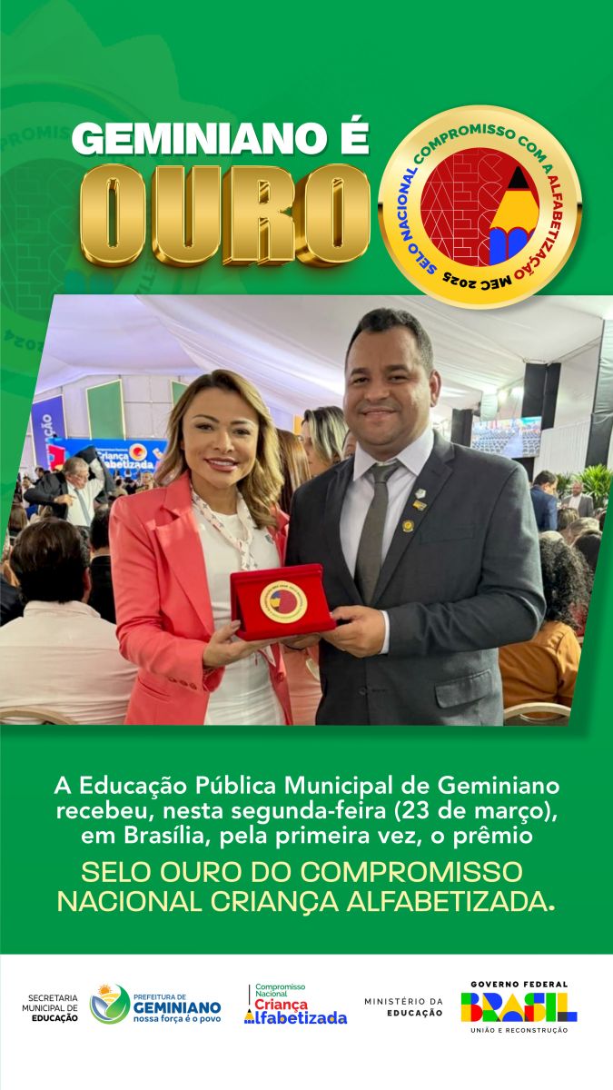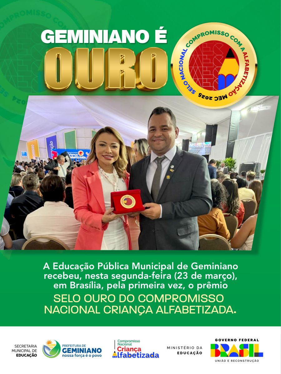 A educação pública de Geminiano viveu um marco histórico na tarde desta segunda-feira (23 de março). Em cerimônia realizada na Esplanada dos Ministérios, o município foi condecorado, pela primeira vez, com o Selo Ouro do Compromisso Nacional Criança Alfabetizada, o mais alto reconhecimento concedido pelo Ministério da Educação (MEC) às redes de ensino que atingem excelência na alfabetização infantil.