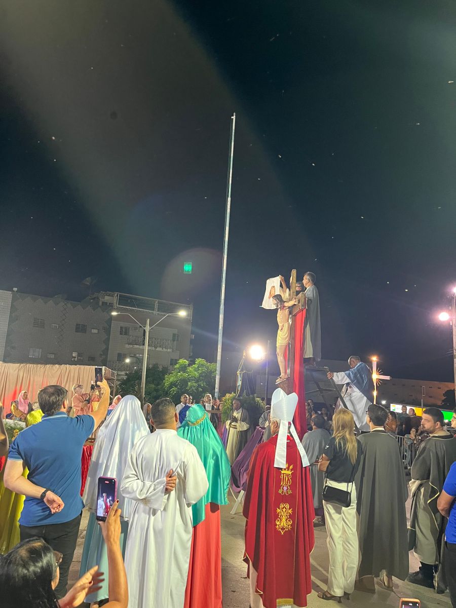 A procissão da Paixão percorreu diversas ruas da cidade, reunindo fiéis em um clima de respeito e devoção. Com velas acesas, cânticos e orações, a comunidade reviveu simbolicamente os últimos passos de Jesus até o Calvário.