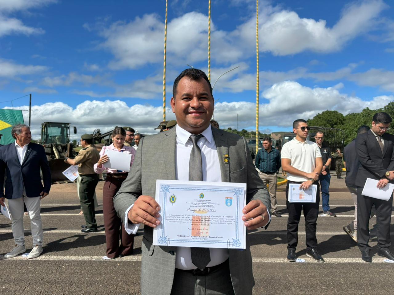 O diploma foi entregue pelo Comandante do 3º BEC, Tenente-Coronel Aécio, que destacou a importância do apoio de gestores municipais às atividades desenvolvidas pelo batalhão.