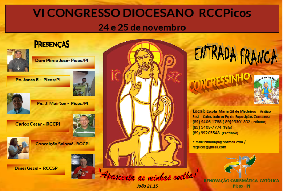 Para desenvolver essa temática, contaremos com as presenças do Conselho Estadual, na pessoa do seu presidente reeleito para o biênio 2013 e 2014, Carlos César. Também pregará no VI Congresso Dinei Gesel, Missionário da RCC São Paulo, ele que coordena o projeto das semanas missionárias que acontecem agora no mês de outubro em todo o país! Confirmou presença os Pe. Jonas, Pe. Mairton, sendo a missa de encerramento celebrada por Dom Plínio José, Bispo Diocesano.