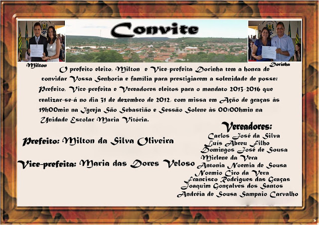 Além de Milton, serão empossados ainda a vice-prefeita Maria das Dores Abreu, a Dorinha (PTB) e os vereadores Carlos José da Silva, Luís Abreu Filho, Domingos José de Sousa, Mirlene da Vera, Antônia Noêmia de Sousa, Noêmio Ciro da Vera, Francisco Rodrigues das Graças, Joaquim Gonçalves dos Santos e Andréia de Sousa Sampaio Carvalho.